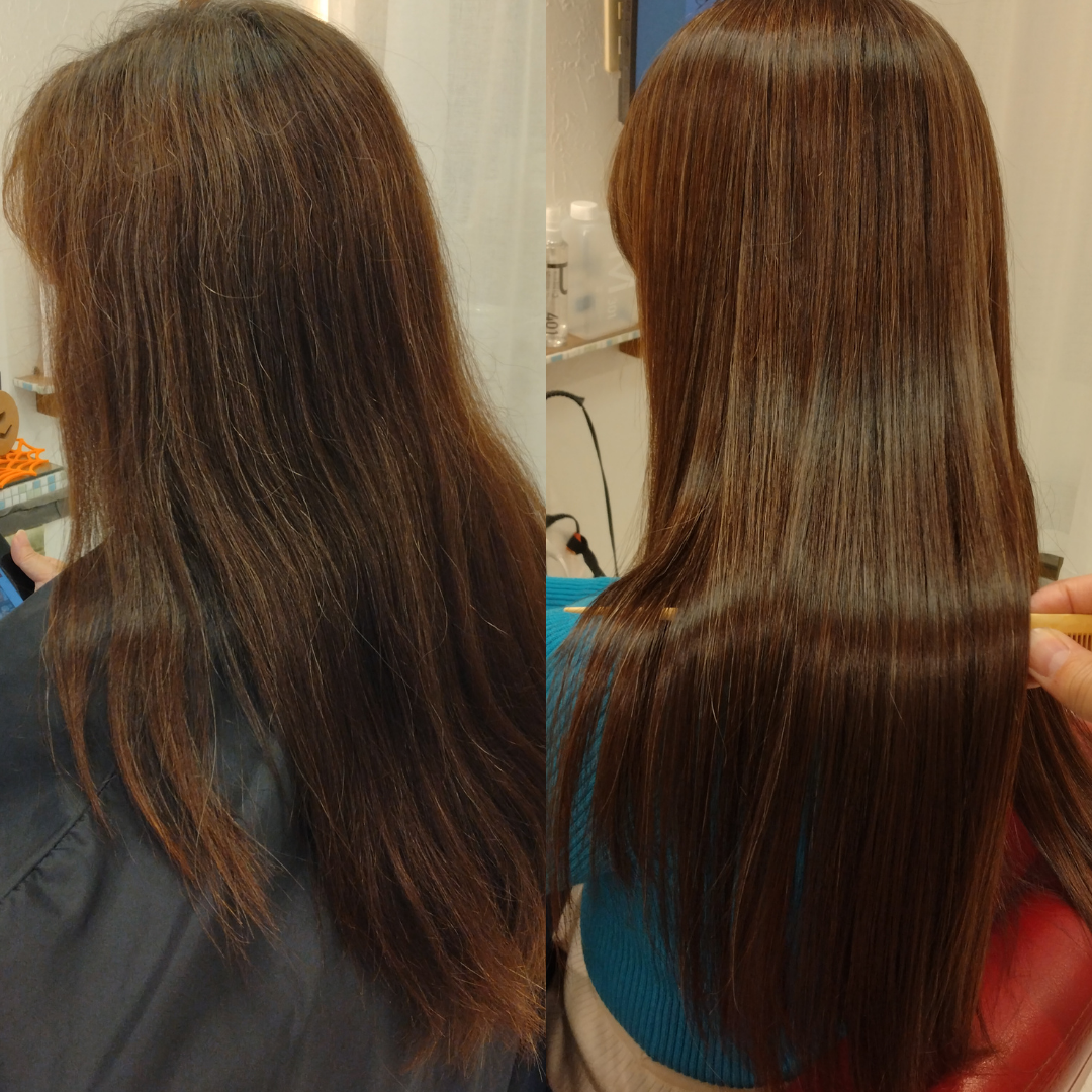 手間と時間がかかっても、従来の縮毛矯正のように、髪がダメージする事で、チリチリになってしまう、リスクを極力減らし、硬く、不自然なストレートにしてしまう、従来の縮毛矯正ではなく、ツヤとしなやかさを保ち、毛先が硬くシャキンとならないにものに、こだわっております。
