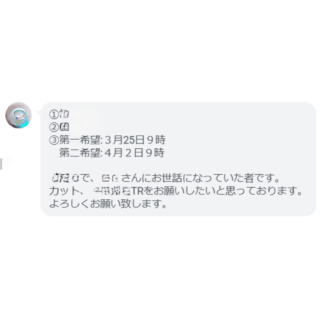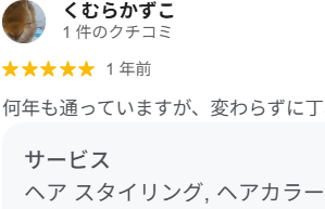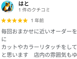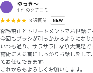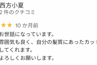 いつもお世話になっています。 お店の雰囲気も良く、自分の髪質にあったカットや髪質改善をしてくれます。 今後もよろしくお願いします。