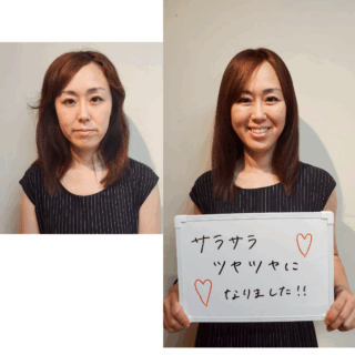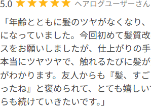 「年齢とともに髪のツヤがなくなり、パサつきが気になっていました。今回初めて髪質改善カラーコースをお願いしましたが、仕上がりの手触りに感動!本当にツヤツヤで、触れるたびに髪が潤っているのがわかります。友人からも『髪、すごくきれいになったね』と...