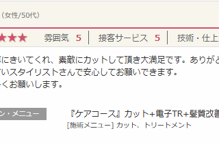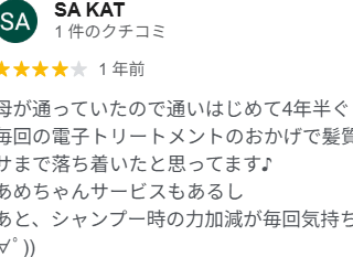 母が通っていたので通いはじめて4年半ぐらい経ちますが 毎回の電子トリートメントのおかげで髪質ががっつりゴワパサからほんのりゴワパサまで落ち着いたと思ってます♪ あめちゃんサービスもあるしあと、シャンプー時の力加減が毎回気持ち良くて本当全てに...