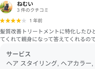 髪質改善トリートメントに特化したひとりひとりの髪質にあった方法で 色々相談してくれて親身になって答えてくれるのでとっても助かってます。