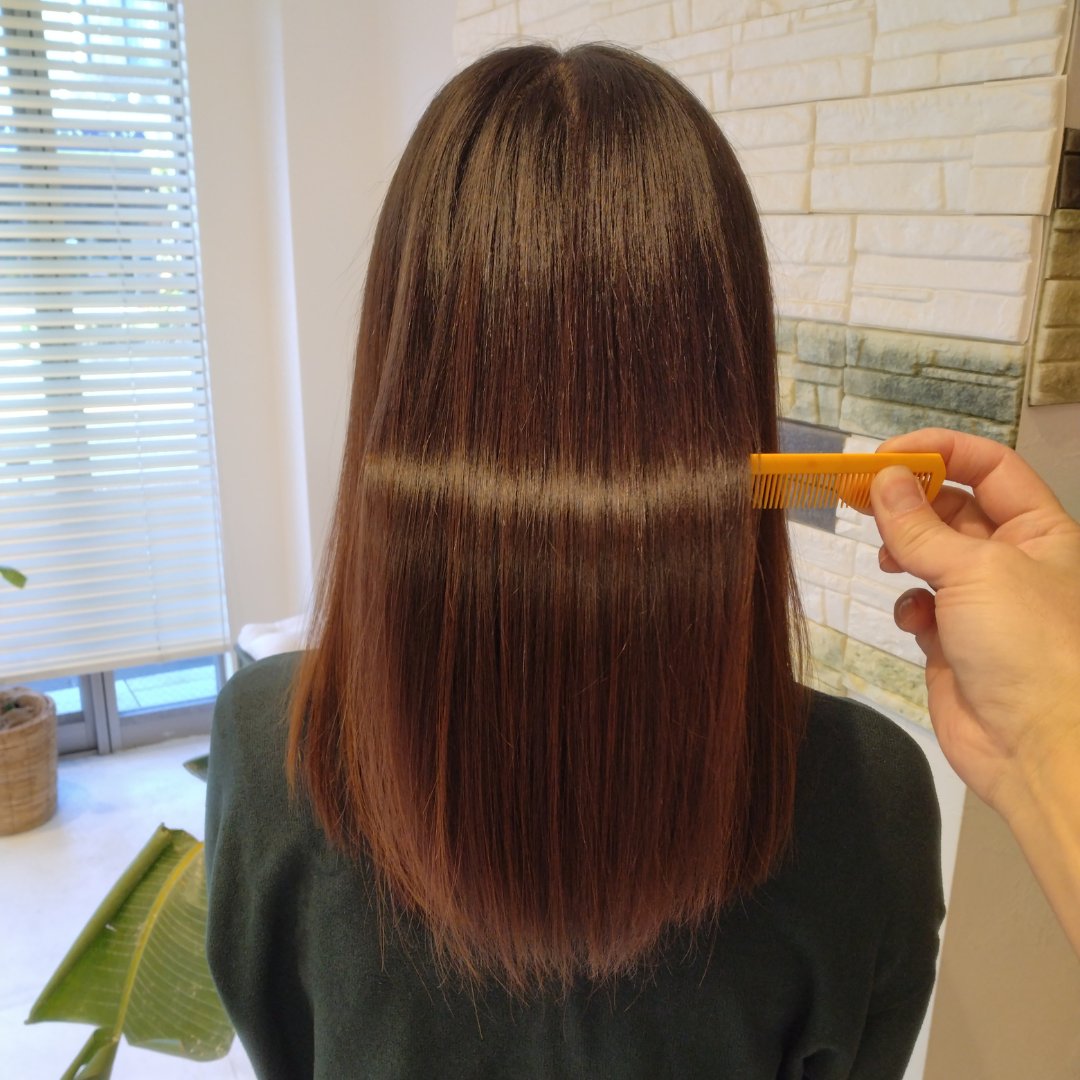 手間と時間がかかっても、従来の縮毛矯正のように、髪がダメージする事で、チリチリになってしまう、リスクを極力減らし、硬く、不自然なストレートにしてしまう、従来の縮毛矯正ではなく、ツヤとしなやかさを保ち、毛先が硬くシャキンとならないにものに、こだわっております。